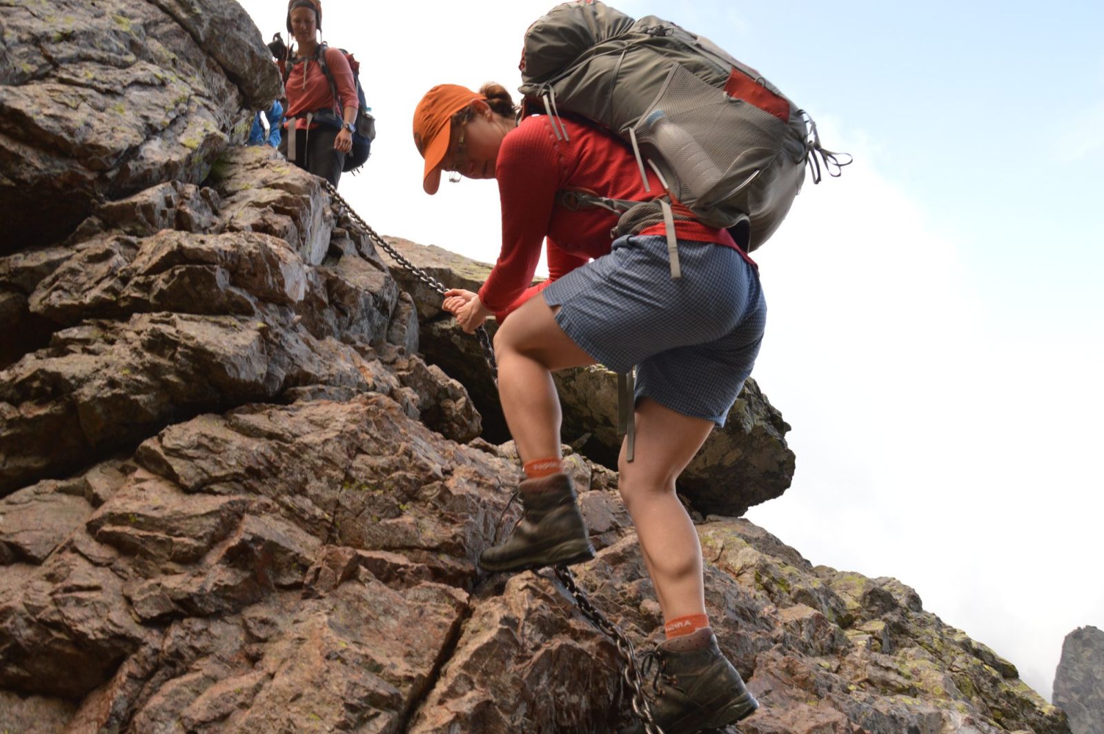 Je třeba sejít 200-250 metrů dolů a to skoro kolmo. Spouštíme se po skále, přidržujeme se masivních řetězů. Naštěstí tu skoro nikdo není, když jsou tady „zástupy“, je to tady určitě mnohem nepříjemnější i nebezpečnější. Jde nám to pomalu, nechceme riskovat pád nebo zranění. Poslední část klesání je holá suť a volné kameny, žádné jištění. Pod námi je propast dalších tisíc metrů dolů a v dáli opět vidíme moře. Cesta se obrací přímo nahoru, opět kameny, sněhová pole, řetězy, v jednom místě i žebřík. Všichni, kdo tu chodí jsou drsoni, žádná ořezávátka. Jeden Amík nám cestou říká, že by to jeho manželka nezvládla, a přejela raději dnešní etapu obrovskou zajížďkou taxíkem. Tam, kde je jištění, tam je to v pohodě, i když je to psychicky trochu náročnější, horší je celá řada míst bez jištění. Od rána je zataženo a celkem chladno. Po dvou hodinách „cesty“ od sedla jsme v dalším sedle (2080 m), po malé svačince pokračujeme dále. Scházíme dolů, na této straně je už pěkná pěšinka. Pouze poslední půl hodinu jsou zase kameny. Ve tři čtvrtě na dvanáct jsme v cíli další etapy, u chaty Tighjettu (1640 m), položenou na krásném místě nad borovicovým lesem. Obědváme. Nad námi je mrak, chvíli prší, chvíli svítí slunce a je dusno, chvíli je naopak zima. Jako na Apríla. Nikdo z chaty neví, jaké má být počasí dnes odpoledne, zkusíme jít dále a ujít dnes ještě jednu etapu, které by neměla vést přes hřebeny.
