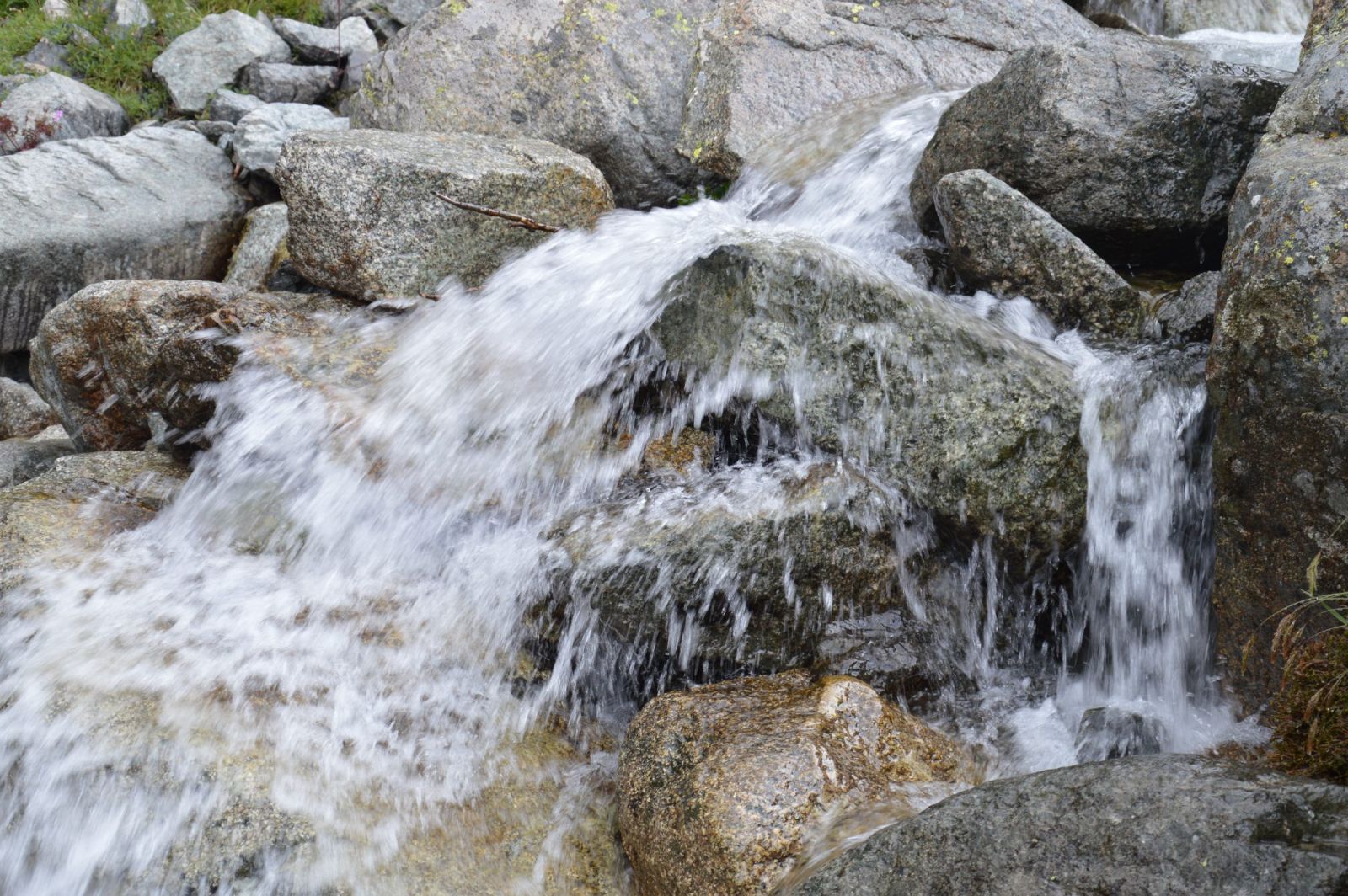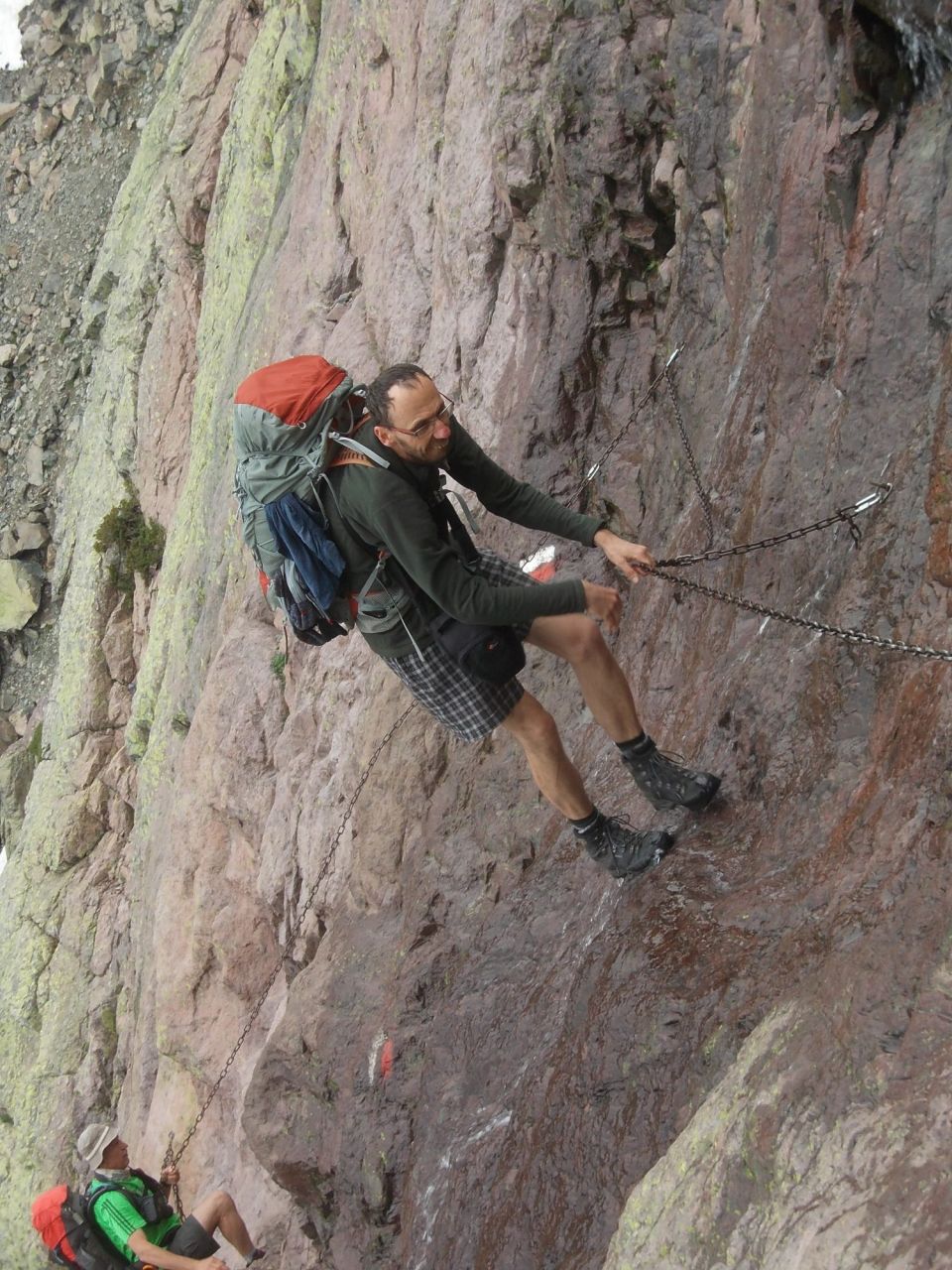 „Bum, prásk!“ Jsou přesně dvě hodiny odpoledne a náhle přichází bouřka, jsme kousíček pod skalnatým hřeben a vrcholy. Hned zastavujeme, spouští se slejvák, první „vrstva“ krup. Když už to vypadá, že déšť slábne, opět na nás dopadnou ledové kroupy a proudy vody se valí po svahu. Čekáme skoro nehnutě, prokřehlí, já se bojím bouřky. Cesta se okamžitě po tom, co déšť začal, proměnila v potok.