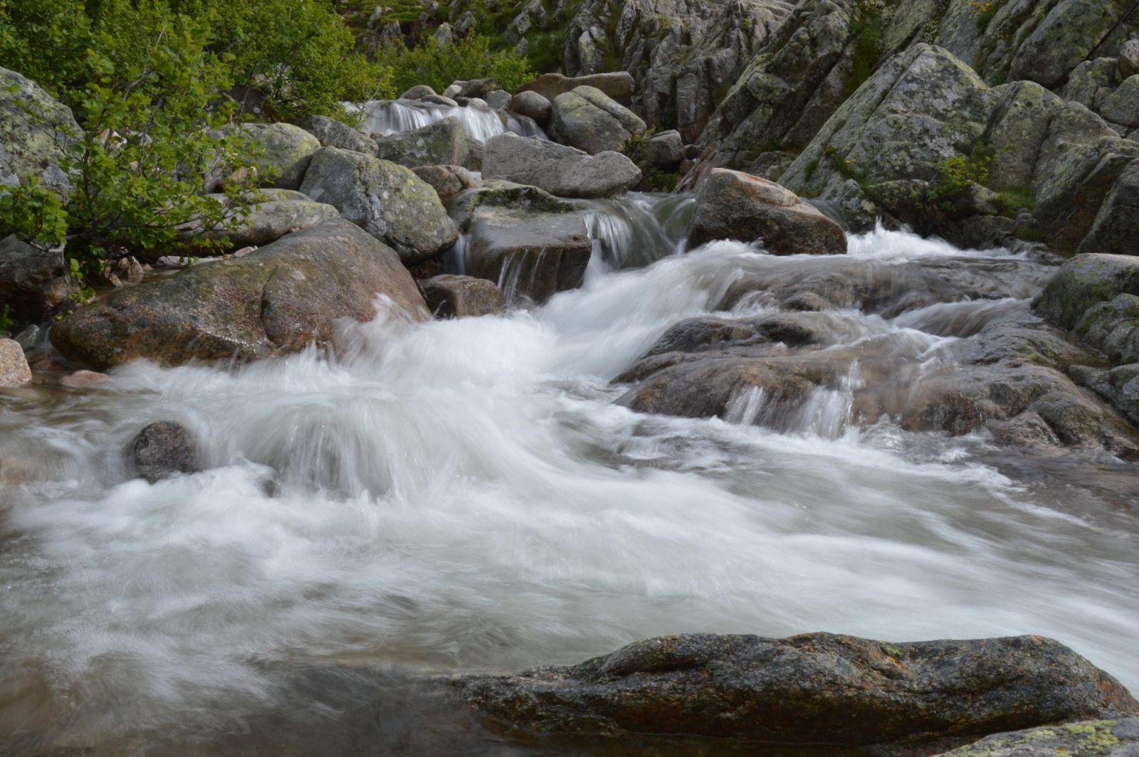 Při skoro jasné obloze, ráno však schovaní hluboce ve stínu hor, snídáme, balíme a ve tři čtvrtě na sedm vyrážíme. Stoupáme vytrvale olšovou kosodřevinou, po balvanech, kolem krásných vodopádů a hlubokého kaňonu. Stejně jako v minulých dnech leží ve vyšších polohách sníh a zmrzlá sněhová pole. Ty nás dovádí až do sedla Capittelu (2225 m), na nejvyšší bod celého treku GR20.