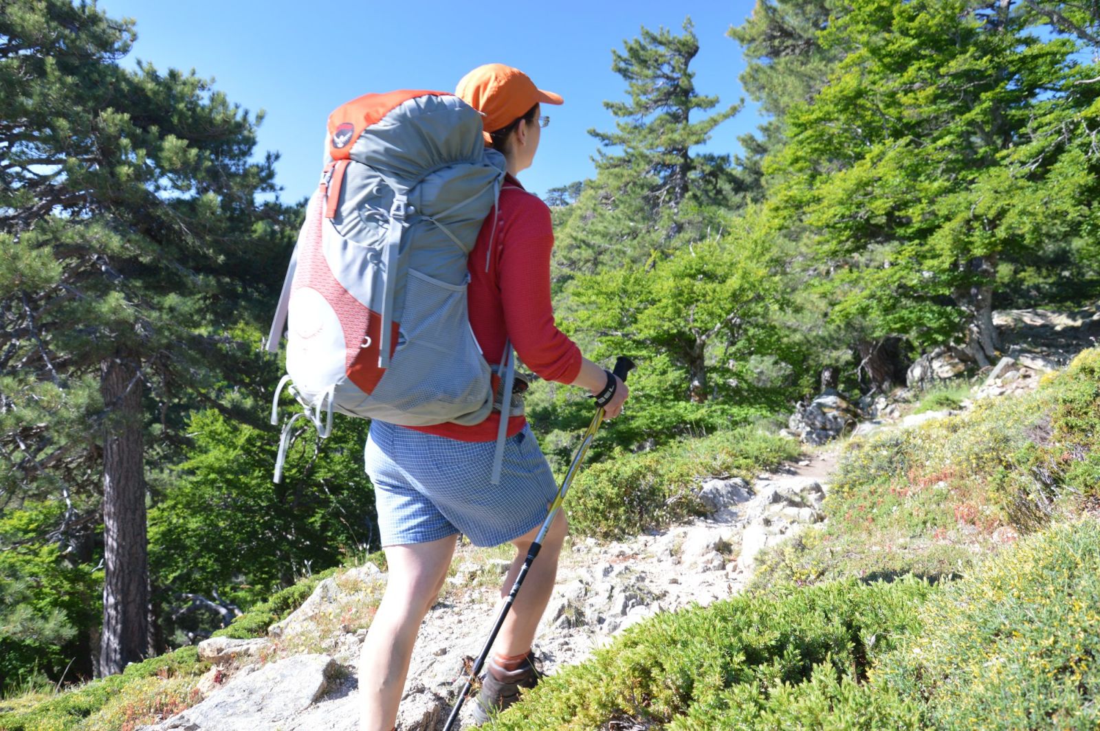 Ještě není ani pět hodin a ze všech stran je slyšet balení věcí, cinkání, šustění, šepot lidí. Vstáváme před půl šestou, turisté již vycházejí na cestu. Když po snídani o půl sedmé vyrážíme, jsme jedni z posledních. Našim dnešním cílem je začít kilometry na jižní části GR20, chceme ujít dvě etapy, celkem asi 35 kilometrů. Začínáme cestou hustým lesem, příjemnou na chůzi, stále vzhůru, čeká nás převýšení 750 metrů nahoru. Slunce od rána prosvítá mezi stromy po celou dobu stoupání.