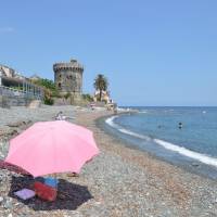 Kousek od pevnosti je obzvláště pěkný dům se záchody nad sebou na balkonech, přímo nad ulicí. Na plácku vedle pevnosti navštěvujeme sobotní trh s biopotravinami. Kupujeme si korsický olivový bioolej. Olivy na něj se prý sklízí jednou za dva roky a proto je prý velmi sladký. Také získáváme sušené biokaštany a domácí biochleba na cestu. V centru Bastie je další náměstí, které bylo asi dříve hlavním náměstím, kde je každodenní trh s čerstvými produkty. Asi deset procent sortimentu je tady také bio. Biosalát, biookurka, biorajčata a máme zeleninu nakoupenou. Ochutnáváme sýrové placky migliacci – palačinkové těsto, v tom kusy sýra a oboustranně osmažené. Také si k obědu každý kupujeme velké plněné kapsy se sýrem. Všechno by bylo moc dobré, ale je to taky velmi drahé. Kupříkladu nejlevnější palačinka na ulici s cukrem bez ničeho nestojí nikde pod 2,5 €. V sámošce kupujeme ještě jídlo na cestu domů a jak dárky korsické sušenky canistrelli. Autobusem jedeme zpět do Miomi, kde se po obědě celé odpoledne válíme na pláži a koupeme se v moři. Pláž je příjemná, kamenitá. Večer sedíme také u moře, s výhledem na vlny a kamenitou pláž. Jdeme brzy spinkat, ráno je budíček v šest, abychom stihli ranní trajekt na pevninu.