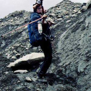 Přes hodinu se potácíme přes ledovec, naštěstí je všude bez viditelných trhlin, i když všude okolo vidíme ujíždějící kameny s bahnem. Na druhé straně nejsou očekávané louky, nýbrž pěšinka, vedoucí po kamenech po okraji ledovce pod skalním masívem. Dlouho, pomalu a útrpně pokračujeme pomalu stálé mírně nahoru. Piji ledovcovou vodu, ze které mám ještě větší pocit žízně. Do toho slunce stále praží. Po půl šesté zastavujeme – to tábořiště tu někde musí být. Necháváme na místě batohy a Jirka jde dopředu prozkoumat terén. Ani po půl hodině však vytoužené tábořiště nenachází. Utábořujeme se na nejbližší bahnité rovince, pod skalami, na místě které by se dalo považovat za tábořiště, kdyby tu ovšem někde byla voda. Ze zbytků ledovcové vody vařím osolený čaj, ale žízeň mám stále. Na více nemám sil. Ostatní jdou dolů na ledovec hledat vodu, což se jim po půl hodině daří. Hance a Ištvovi se dnešní cesta vůbec nelíbila, nadávají, mě to hodně mrzí – já jsem si myslel, že to tu bude pěkné. Vlastně si stěžují již od rána, a to taky přispělo k tomu, že se mi dnes nešlo moc dobře. Třeba ony hledané pěkné travičky jsou jen kousek chůze. Ledopád naproti přes ledovec, který bych rád viděl z blízka, je stále velmi daleko. Nedá se nic dělat, ráno s chladnou hlavou rozhodneme, co dál.
