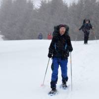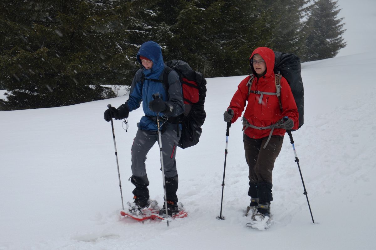 Nakonec se zcela zatáhlo, turistická značka zmizela, i když bylo jasné, že musíme držet směr a hřeben. Šli jsme po široké lesácké cestě (nebyla zaznačena v tištěné mapě), která podcházela hřeben nad námi. Dost sněžilo, ještě že už jsme se nemuseli prodírat mezi větvemi po pěšince. Z cesty jsme pak přešli na hřebenovku, kde konečně byla opět spousta sněhu, a kolem páté jsme došli na loučku‑sedýlko (ve výšce asi 1750 metrů). Foukalo. Hlasovali jsme, zda zůstaneme již zde a nebo budeme pokračovat ještě kousek dále, do dalšího sedýlka. Více z nás chtělo zůstat.