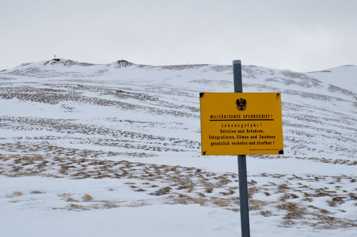 Velmi fučelo, bylo zcela zataženo; naštěstí vítr ještě neznemožnil další prostup. Cedule s nápisem zákazem focení nás přivítala ve vojenském prostoru „Truppenübungsplatz Seetaler Alpe“, patřící rakouské armádě. Jak sami uvádí, 300 dní v roce se zde střílí a platí sem zákaz vstupu, takže dnes jsme měli docela štěstí, že se dovnitř mohlo. Vojenský prostor zaujímá i kus hlavního hřebene a obejít ho ze strany, odkud jsme přišli, skoro nešlo. Turistické rozcestí v mlžné dálce se zblízka ukázalo jako vysílač a pod ním byl vojenský „úkryt“.
