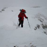 Stále velmi fučelo, sluníčko pěkně svítilo a mohli jsme se těšit krásnými výhledy na všechny strany. Krásně byl vidět slovinský Triglav (100 km daleko), údajně i Großglockener (140 km), dále nám ze sněžnic známé pohoří Totes Gebirge, Hochschwab, Rax a mnohé další. Nejbližší známé hory byly Gleinalpe (40 km), kde jsme byli na sněžnicích předloni. Rychle jsme se společně vyfotili a „utíkali“ před větrem dolů. Po prudkém svahu jsme ve sněhu mezi kameny sestoupili z vrcholové špice a dostali se na vrcholovou pláň (cca 2200 m n. m.). Na pláni byly zase jen zbytky sněhu mezi trávou, kravinci a kamením. Se sněžnicemi na batozích jsme pohodlně mírně scházeli, stále k jihu. Minuli jsme horu Fuchskogel a ledovcový kar s jezerem pod ním. Už bylo vidět sedlo, kam jsme mířili a my to vzali zkratkou. Na prudších svazích byl konečně zase sníh – půlka z nás to vzala dolů na sněžnicích. Prošli jsme kolem pramene vody – hurá! – nemusíme na vaření tavit sníh.
