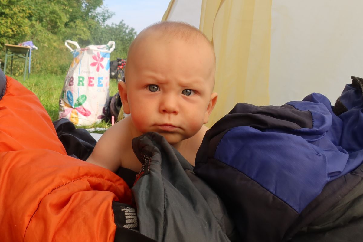 Od ráno bylo vedro na zhebnutí, naštěstí na našem plácku byl i kus stínu, kde jsme se krčili před spalujícími slunečními paprsky. Vedro mělo výhodu: vše mokré hned uschlo! Vstali jsme kolem sedmé-půl osmé, v Dunaji se pěkně praly plínky. Už už jsme chtěli s Bárou vyrazit napřed, že se zastavíme ještě na hřišti, a zjistil jsem, že kolo vozíku je opět píchnuté, Dunaj jsme využili (ponořením do řeky) na zjišťování, odkud z duše uniká vzduch a následně jsem lepil díru.