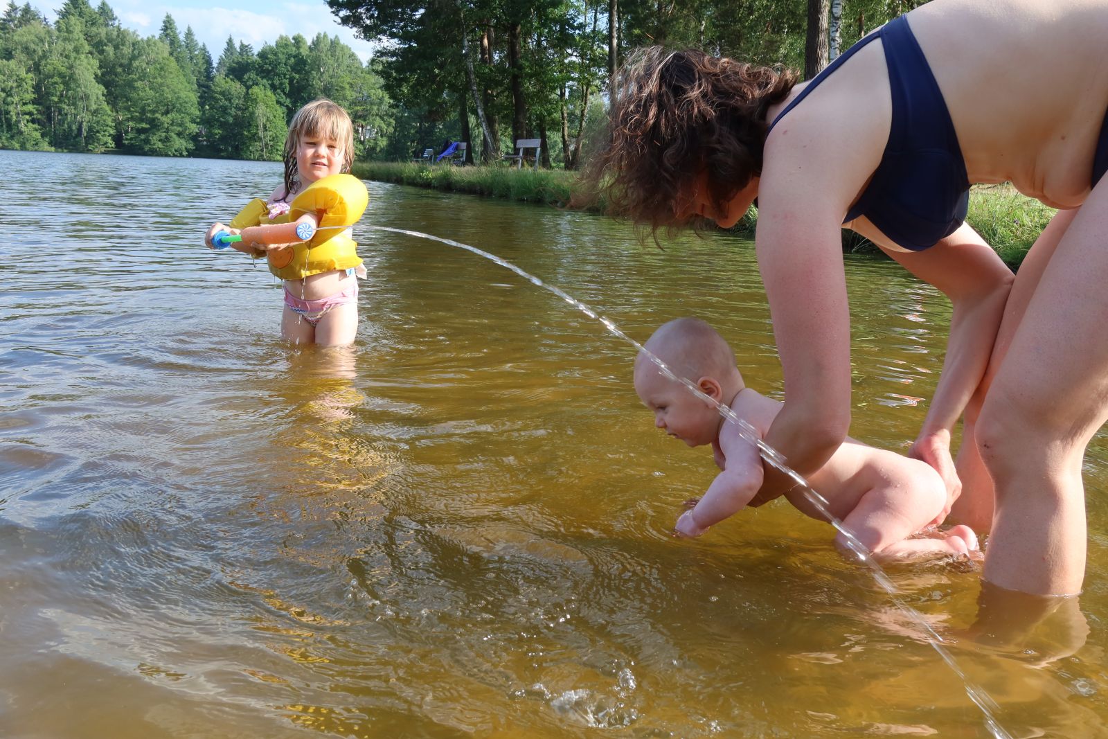 Přečetli jsme si vzkaz od rodinky K., že jsou trochu nemocní a odpoledne pojedou úplně jiným směrem, než jsme my, a dále také někam jinam, než nám všem původně naplánovali. My se rozhodli, že dojedeme dle původního plánu na jih podél řeky do Řezna a dále se uvidí. Na kolech jsme pokračovali, Bára hned usnula. Jelo se nejen podél pěkné řeky, ale bohužel i podél nepěkné a hlučné dálnice. Cestou pod splavem perfektní pláže s infrastrukturou, taky spousta lidí (ale bez hřišť pro děti).