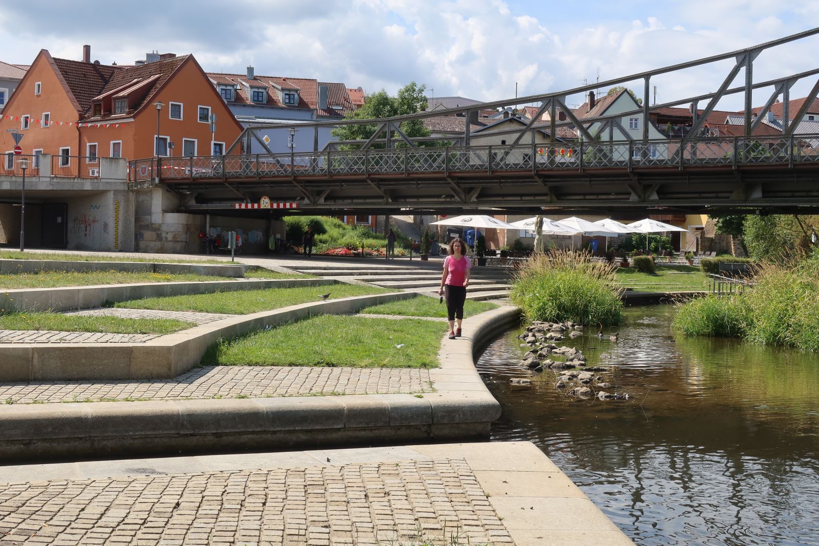 Ráno bylo po nočním ruchu ticho, jen pár pejskařů, kolem osmé již krásně svítilo slunce, snídali jsme. Trochu nás zdržovalo, že se s jedním klíčem chodilo daleko na toalety a umývání. Po desáté měla naše rodinka sbaleno a chtěli jsme vyjet. Ale ouha: prázdné kolo od vozíku. S Bárou jsem tekoucí řeku Regen využil na hledání díry v duši. Byla opravdu píchnutá, lepil jsem. Kolem půl jedenácté jsme vyrazili, že počkáme opodál na kraji městského centra na břehu řeky. Tu jsme asi hodinu a čtvrt čekali na pěkném místě pod centrem, pod mostem přes řeku, byly tu moderní mola=přístupy na vodu na pozorování kachen a dalších vodních ptáků, kterých bylo v okolí řeky spousta: volavky, čápi, divoké husy. Jana si zašla s Bárou na rychlou návštěvu centra.