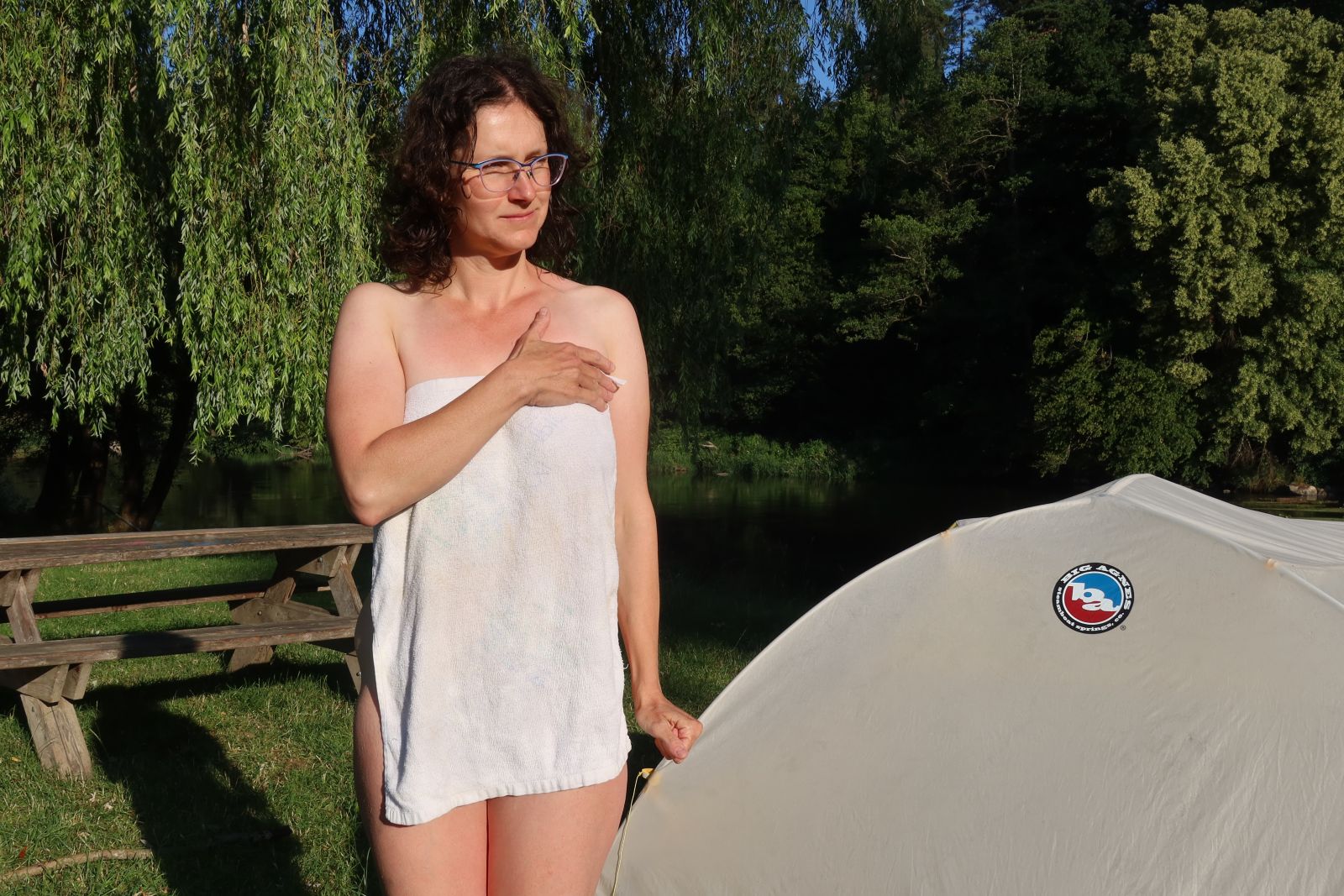Kemp byl skoro prázdný, byl to pozemek kanoistického klubu, Kanu-Clubu. Fungoval totálně nízkoprahově, žádné dotazy, žádné formuláře, žádná recepce. Jen uvnitř budovy se do obálky vložily peníze a napsal počet dospělých osob (2) a počet nocí (1), dohromady jsme zaplatili 20 euro. Autem se do areálů nesmělo, tak tu tábořili jen samí cyklisté (mohli by i pěšáci a vodáci).