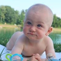 Přejeli jsme z Bavorska do Horního Rakouska. Konečně tu byly perfektní výhledy na řeku. Ve vesnici Niederranna jsme chtěli přejet most a pokračovat posledních deset kilometrů na pláž/ do kempu. Těsně před nájezdem na most jsem si na poslední chvíli všimli, že nahoře nad silnicí chodí lidi v plavkách, že by nějaká voda? Opravdu. Byl to menší klasický betonový bazén, na jedné straně mělčina a na druhou stranu se skloňoval do hloubky (na mapách.cz nebyl zaznačen jako koupaliště). Napájený byl potokem, voda byla tudíž dost studená, výrazně studenější než Dunaj, ale kvalitní a osvěžující. Hodinu a půl jsme tu pobyli, koupali se, Bára si užila plavání v mělčině, mimi mělo pro sebe stín. Kromě nás tu bylo jen pět dalších lidí. Starší paní Báře radila, jak má příště běhat kolem bazénu, aby nespadla do vody.