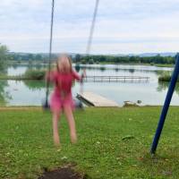 Posnídali jsme na pěkných lavicích (pod přístřeškem si sušili věci Španělé), velký rozdíl proti minulému kempu. Rozloučili jsme se s Polákem, ten zjistil, že mu vlastně nic nechybí, tak mohl pokračovat v cyklojízdě. Sbalení jsme vyrazili a po půl kilometru dojeli k dalšímu koupacímu jezeru. Už na této krátké cestě byla vidět spousta listí na zemi, polámané větve i několik vyvrácených stromů. Na velké mapě areálu jsme si náhodou všimli, že štěrkové koupací jezero „římská dvě“ má na straně od Dunaje samostatnou a velkou zátoku pro děti: pěkný přístup do vody, všude bylo mělko, bylo tu molo, dětská skluzavka do vody. Ač bylo zataženo a poměrně po bouřce chladno, Báře to nevadilo; sama poprvé plavala více než jen pár metrů. I na skluzavku se odvážila, ač to byla celkem žucha do vody. Vedle vody bylo velké dětské hřiště.