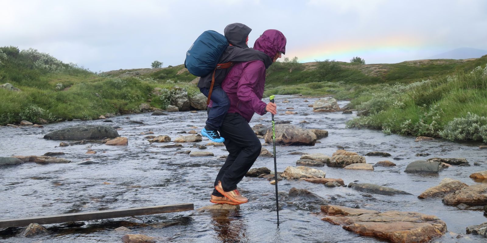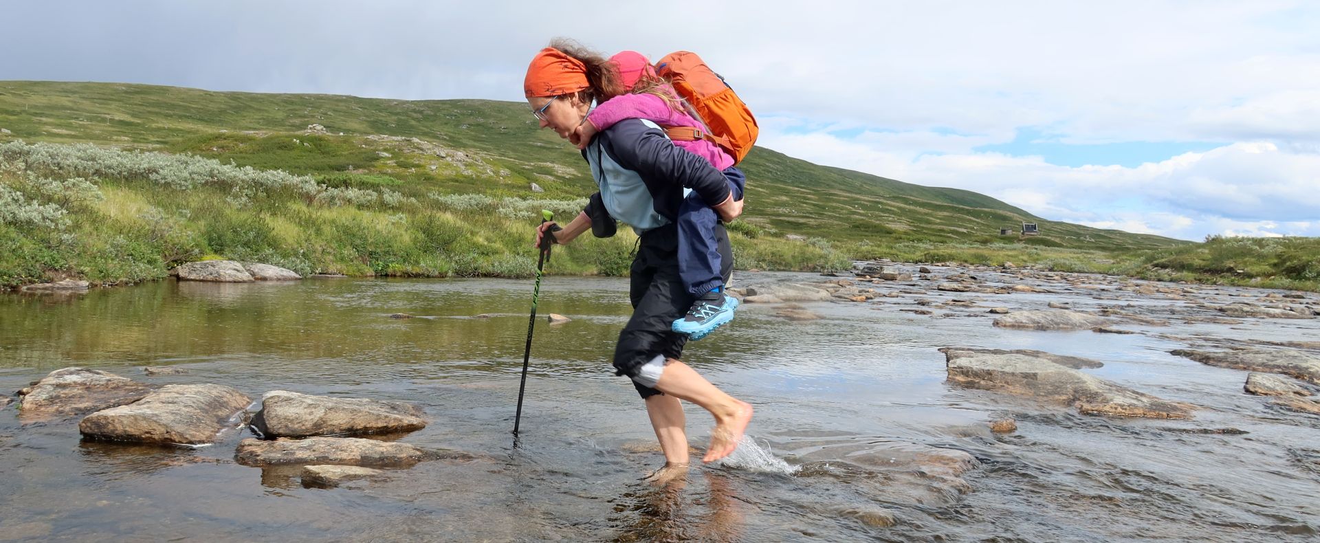 Do Švédska jsme vyrazili na přechod hor „natěžko“ se dvěma stále malými dětmi a – stejně jako loni v italských Orobských Alpách – jsme si postupně zdokonalovali cestovatelské dovednosti. Na horách jsme zažili náročná a exponovaná místa, ale jiným způsobem než v předchozích letech. Starší dítě (pět a tři čtvrtě roku) chodilo již třetí sezónu samo, mladší (dva a půl roku) se většinou neslo v krosničce na zádech, ačkoli zvládlo ujít i krátký úsek samo. Nejdůležitější bylo vzít si co nejméně a co nejlehčí vybavení, aby se nám všechno vešlo do zavazadel a dalo se unést; stejně jsme postupovali i s jídlem. Bylo jasné, že pokud nesu dítě v krosničce na zádech a máme s sebou vybavení a jídlo pro čtyři osoby, tak se Janče vše nevejde do jejího lehoučkého batohu (objem 55 l). Proto musela vláčet velký batoh (70 l). Ze začátku ho měla dost těžký, vážil asi stejně jako moje krosna s dítětem. Dovnitř se jí sice všechno vešlo, ale první dny musela mít přivázané dvě velké karimatky zvenku, dokud neubylo jídlo. Poté se už jedna karimatka vešla dovnitř.