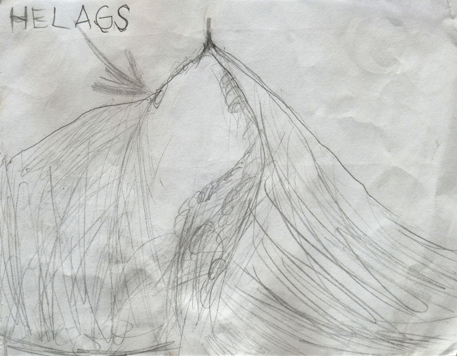 Slunce už zase nesvítilo, foukalo a zároveň tu bylo dost komárů, což se u řeky a u bažin dalo očekávat. Když jsme šli prát do potůčku, využili jsme i síťky na hlavu proti komárům, které Janča pro děti doma před odjezdem ušila (my měli své z minulých cest). Trochu jsem se v potůčku i umyl (včera byla teplá sprcha v ceně, ale nechtělo se mi, taky proč plýtvat). Bára seděla před chatou a malovala chatičku a vrcholek hory Helags, já jsem s Jančou upravoval vycpávku popruhu na batoh. Borůvky tady sice rostly, ale ještě potřebovaly dozrát, morušky jsme zase nepotkali (zatím jen první den bylo pár kusů). Pozorovali jsme mnoho sobích stád, na rozcestí jsme našli sobí paroh. Bára si užívala dnes i minulé dny, že jako jediná měla nepromokavé boty, takže jí nevadilo šlapat do bláta. Šli jsme stále plochou krajinou, ač kolem nás v dálce byly pořád vysoké kopce. Za celý den jsme potkali jen čtyři turisty, všichni byli v okolí říčky, u které nocujeme.